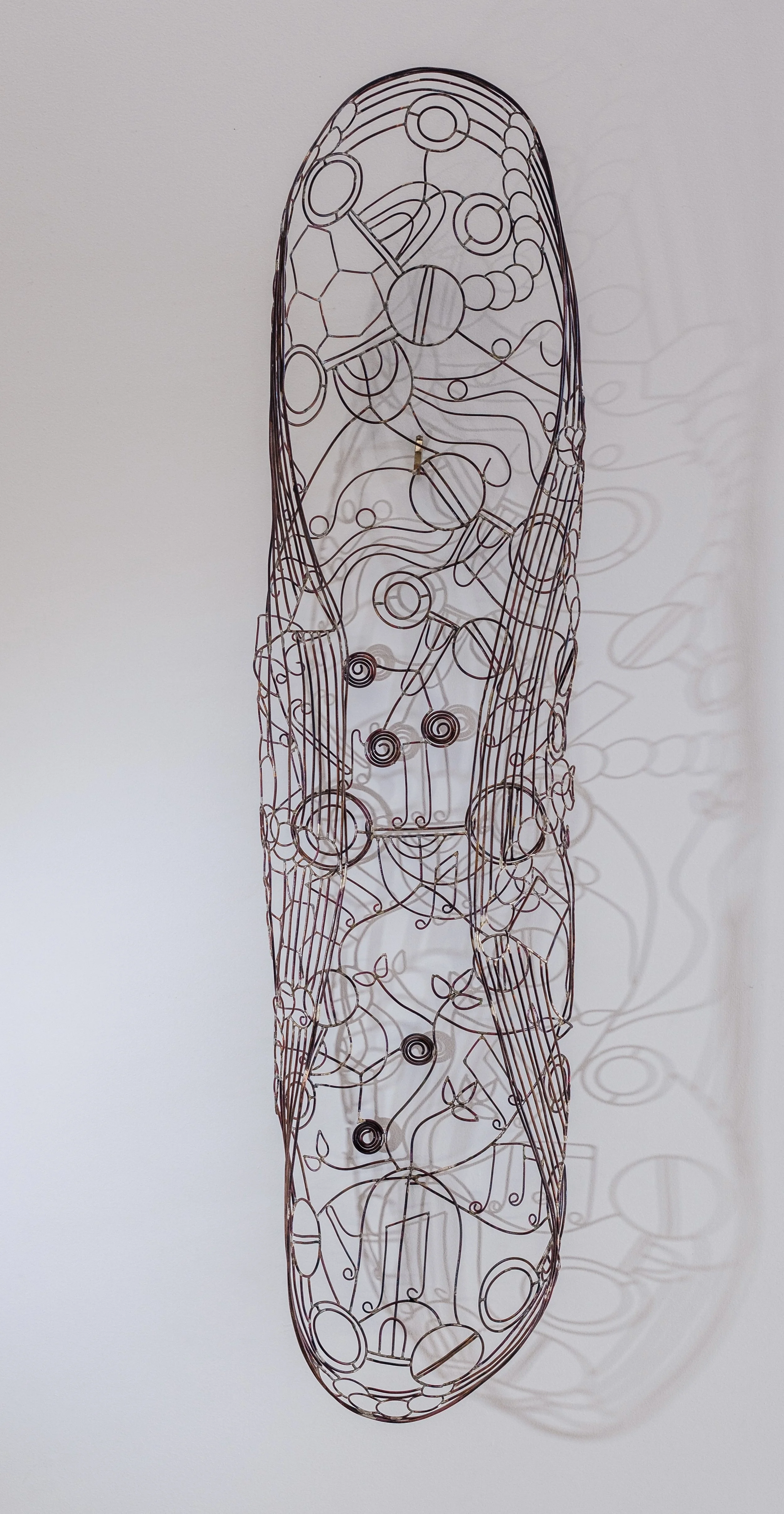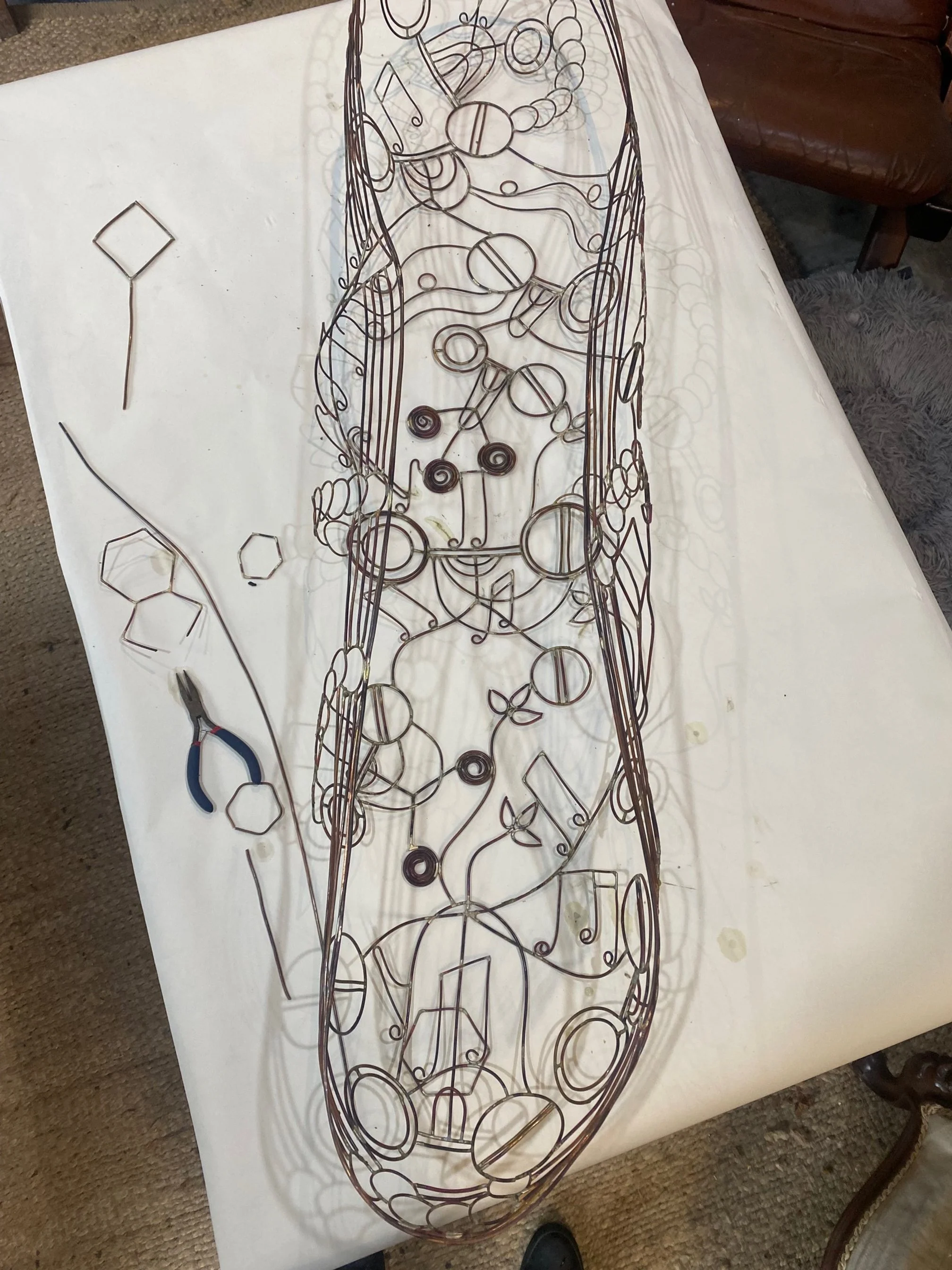 This copper wire coolamon tells the story of four generations of a family. Length 1500mm 2025.