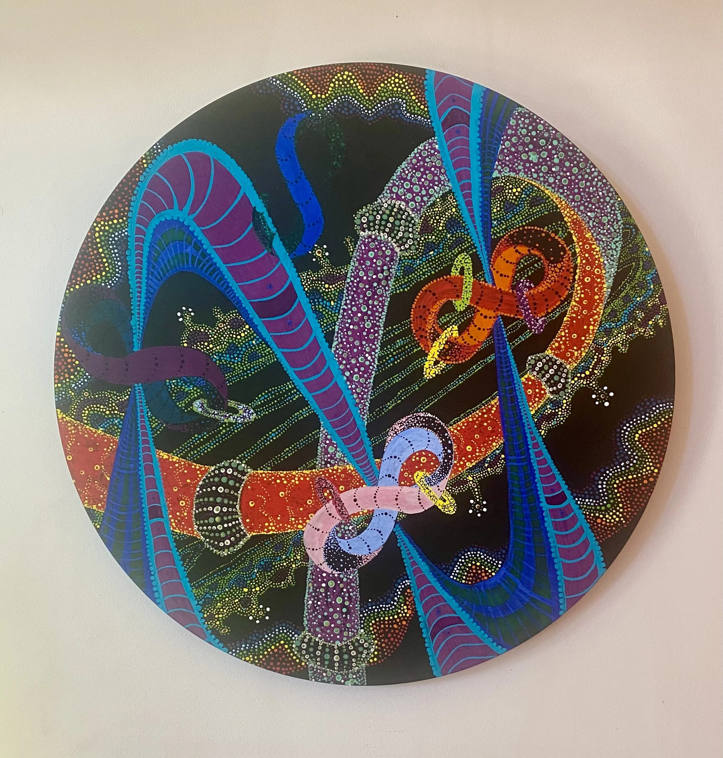 Drawing on the Aboriginal construct of Dadirri, (‘deep listening’), this confidential conversation totally informs the composition, colour pallet and the iconography of the work.